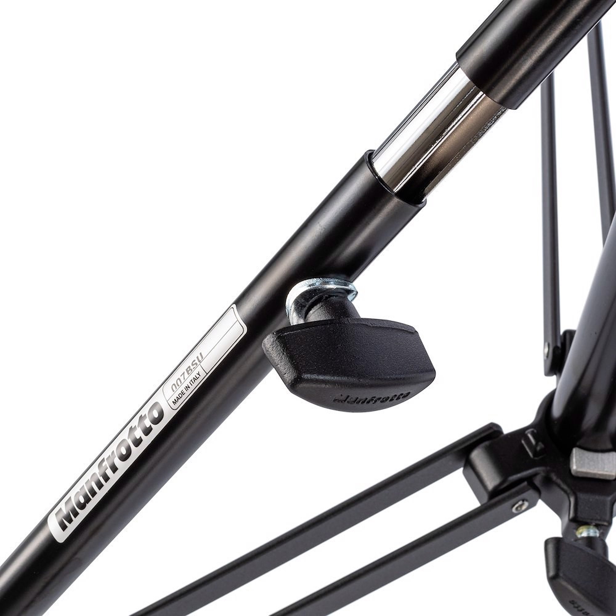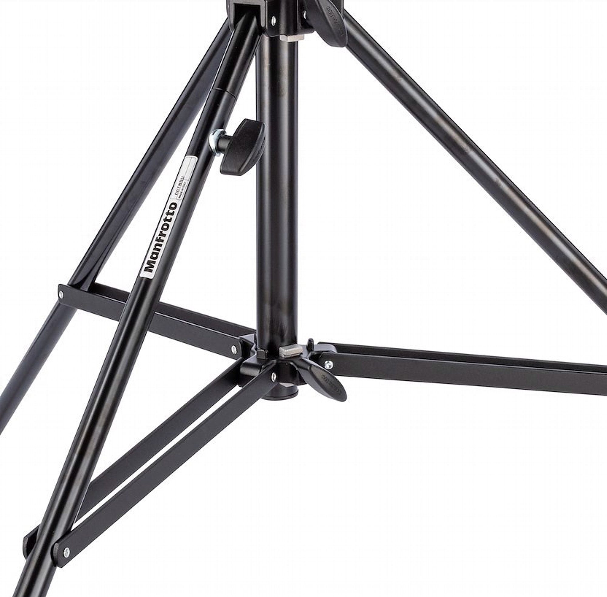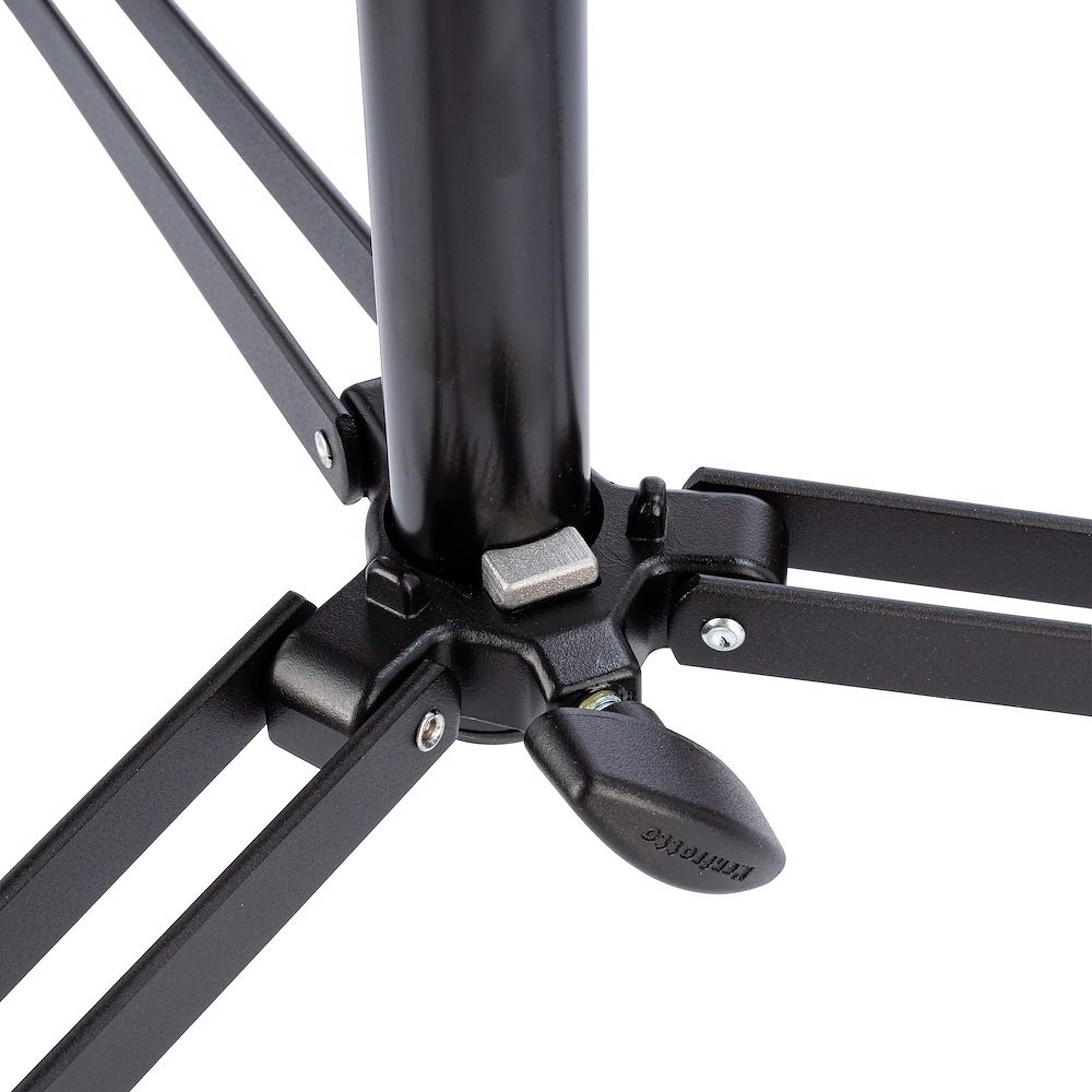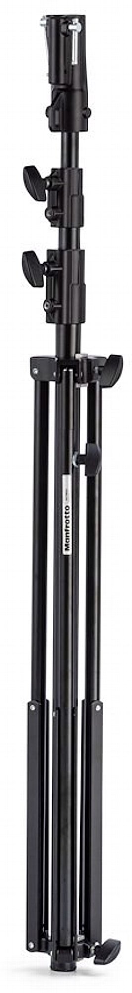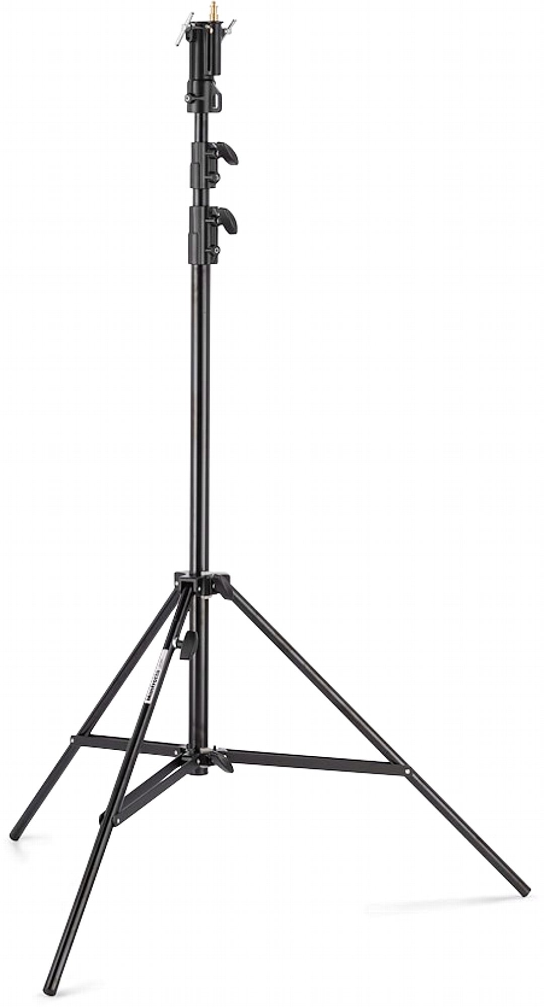 Leuchtenstativ mit 3 Sektionen, Material Aluminium, Farbe schwarz – 5/8" und 1 1/8" Hülse – Rohrdurchmesser 35, 30 und 25 mm – Max. Höhe 325 cm – Min. Höhe 124 cm – Länge zusammengeschoben 122cm – Stellfläche Durchmesser 118 cm – Max. gleichmäßg verteilte Last 20 Kg – Max. Last bei 5 ° Neigung und max. Auszug 6,7 Kg – Gewicht 7,3 Kg