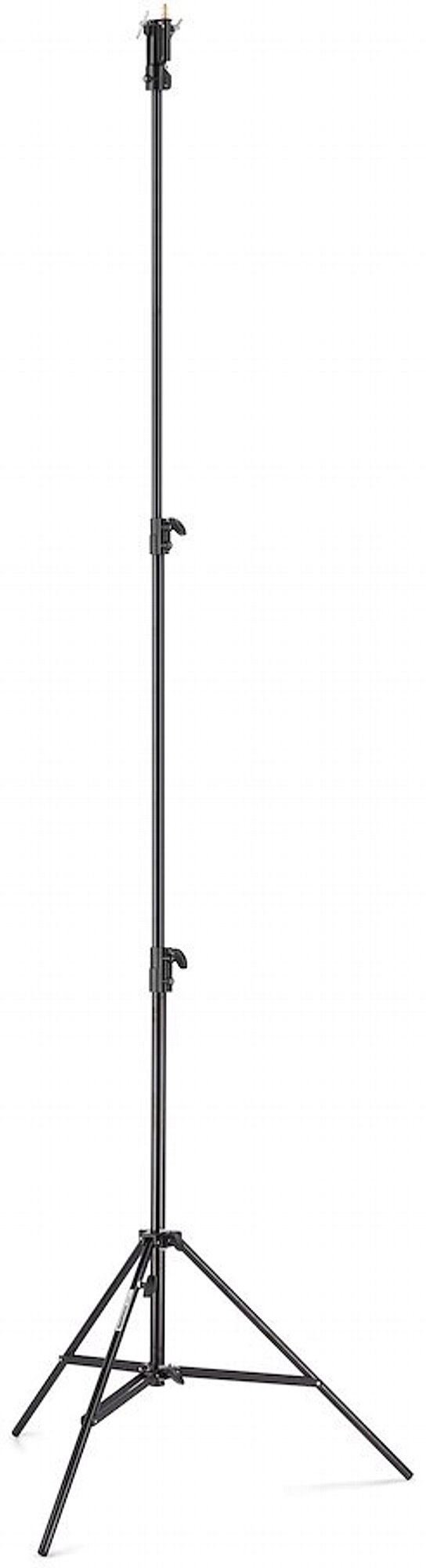 Schwarzes, verchromtes Leuchtenstativ aus Stahl mit 3 Sektionen, davon 2 ausfahrbar. Tragfähigkeit 20 kg bei senkrechter, 6,7 kg bei 6° geneigter Aufstellung. Passende Stativwagen sind die Modelle 109, 110 oder 110G.