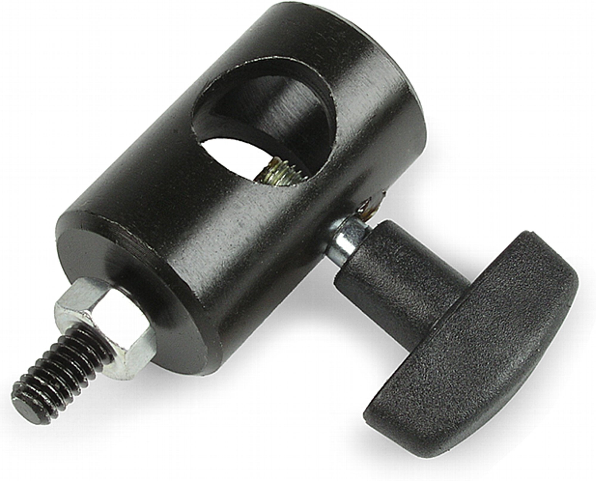 Adapter mit 5/8" Bohrungen in senkrechter und waagerechter Anordnung mit Feststellschraube. Zur Montage ist ein 1/4" Außengewinde mit Kontermutter vorhanden.