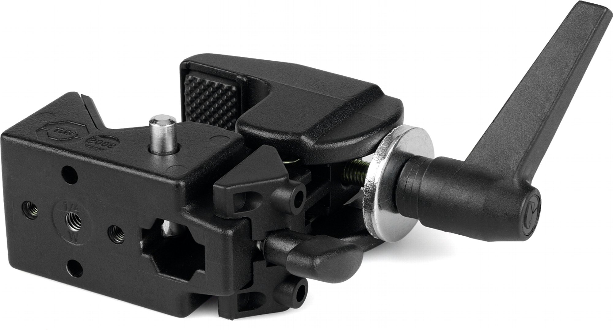 Die Manfrotto MA 035 Super Clamp verfügt über eine Knebelschraube, um eine schnelle und zuverlässige Klemmung zu gewährleisten. Keilförmige Einsätze für eine optimale Klemmung an flachen Gegenständen gehören zum Lieferumfang.