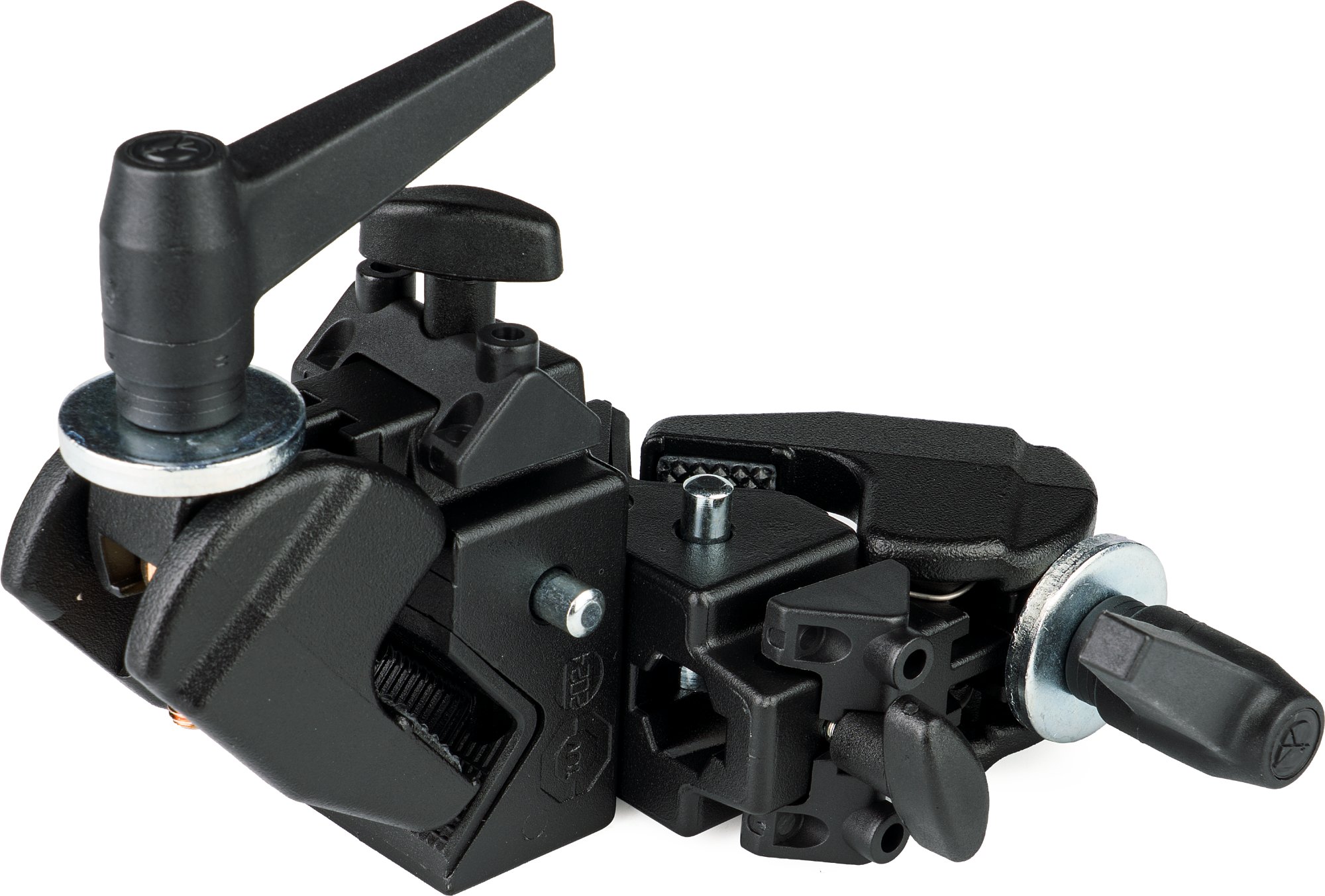 Die Manfrotto MA 038 Double Super Clamp besteht aus zwei rechtwinklig miteinander verschraubten MA 035 Super Clamps. Sie eignet sich besonders für eine sichere Montage von Rohren oder Stangen mit Durchmessern von 13 bis 55 mm.