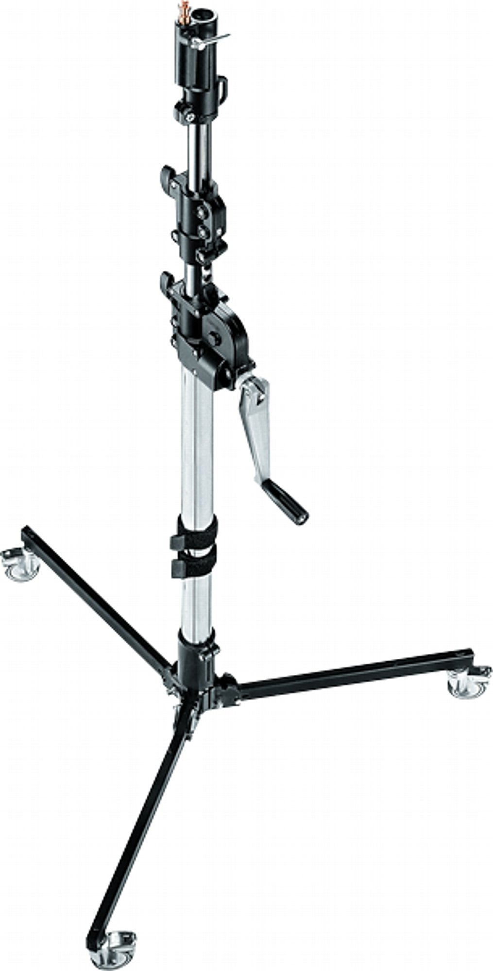 Lampenstativ aus Stahl mit 3 Sektionen, 2 Auszügen zur Aufnahme von fototechnischen Geräten mit 1 1/8" Stativanschluss - Kurbelmittelsäule, beide Auszüge werden simultan ausgefahren - Durchmesser des Standfußes 100 cm - Länge geschlossen, zusammengeschoben 134 cm - minimale Arbeitshöhe 144 cm - max. Arbeitshöhe 276 cm - Befestigung, Stativanschluss MA 14 - Gewicht 16 kg - maximale Belastbarkeit 30 kg bei gerader Aufstellung