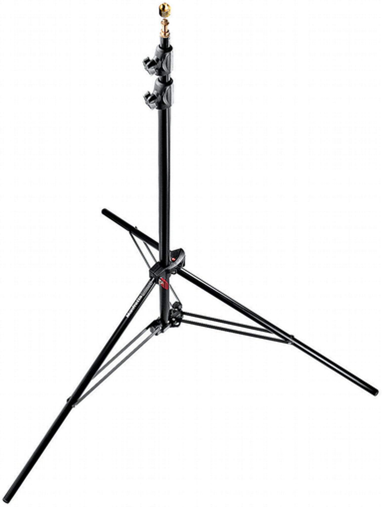 Schwarzes, verchromtes Leuchtenstativ aus Stahl mit 3 Sektionen, davon 2 ausfahrbar. Tragfähigkeit 20 kg bei senkrechter, 6,7 kg bei 6° geneigter Aufstellung. Passende Stativwagen sind die Modelle 109, 110 oder 110G.