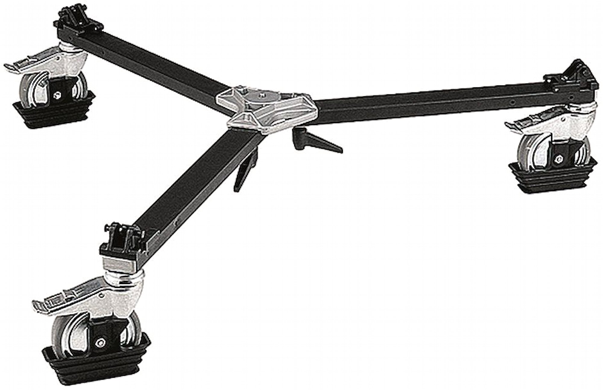 Solider Kamerawagen mit bremsbaren 127 mm Rädern und Kabelabweisern. Dieser Stativwagen lässt sich auf 60 cm Länge zusammenklappen. Ein 3/8"-Gewinde in der Mitte ermöglicht die Befestigung von Videoneigern für tiefe Kamerapositionen. Ideal für schwere Kamerastative.