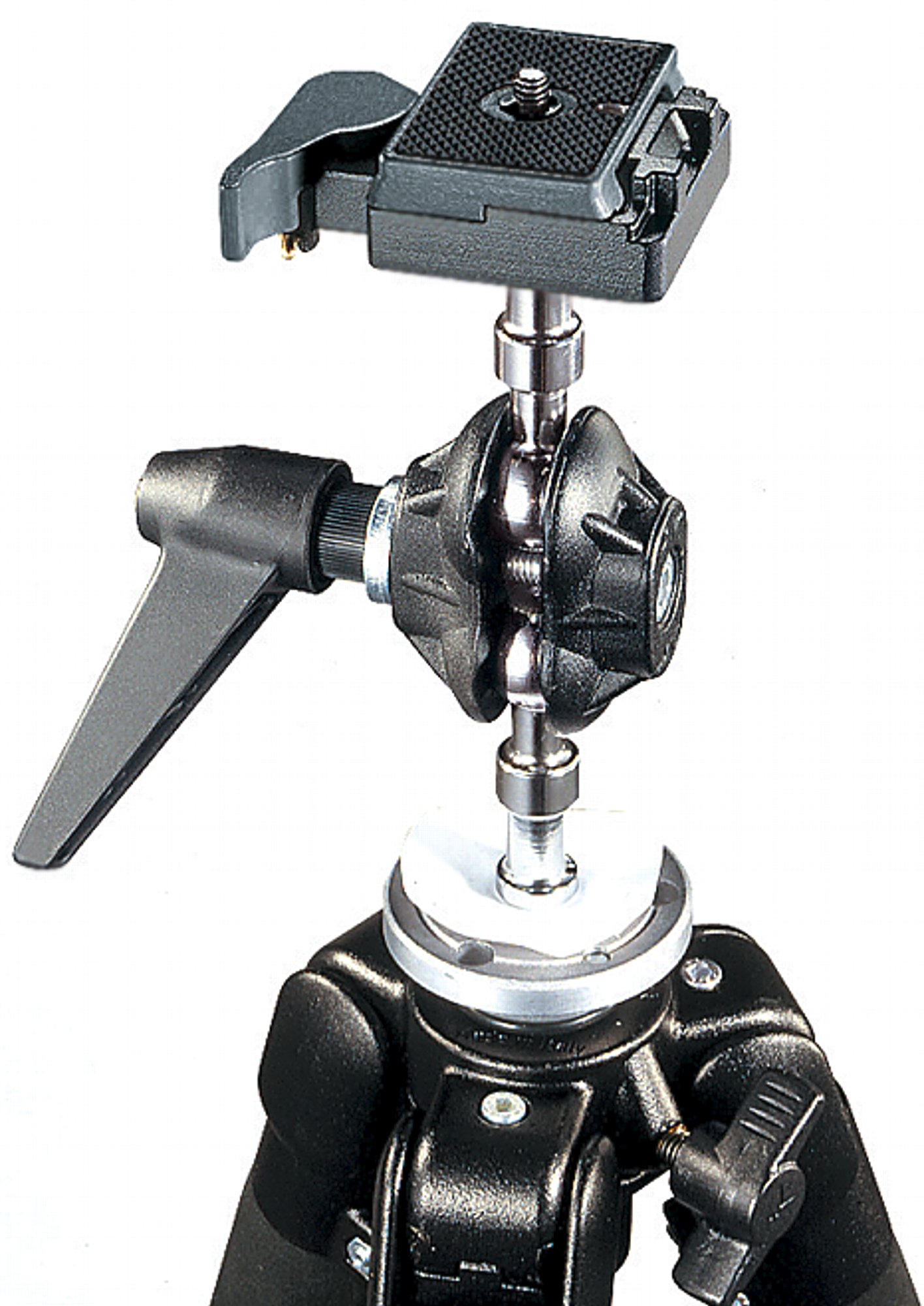Robuster Doppel-Kugelkopf für mittelschwere Kameras, Montage mit Hilfe von Superclamp 035, mit Schnellwechseleinrichtung 200PL-14, 1/4" und 3/8" Kameraschraube, Farbe Schwarz – Höhe 15 cm – Gewicht 0,6 kg – maximale Belastbarkeit 5 kg