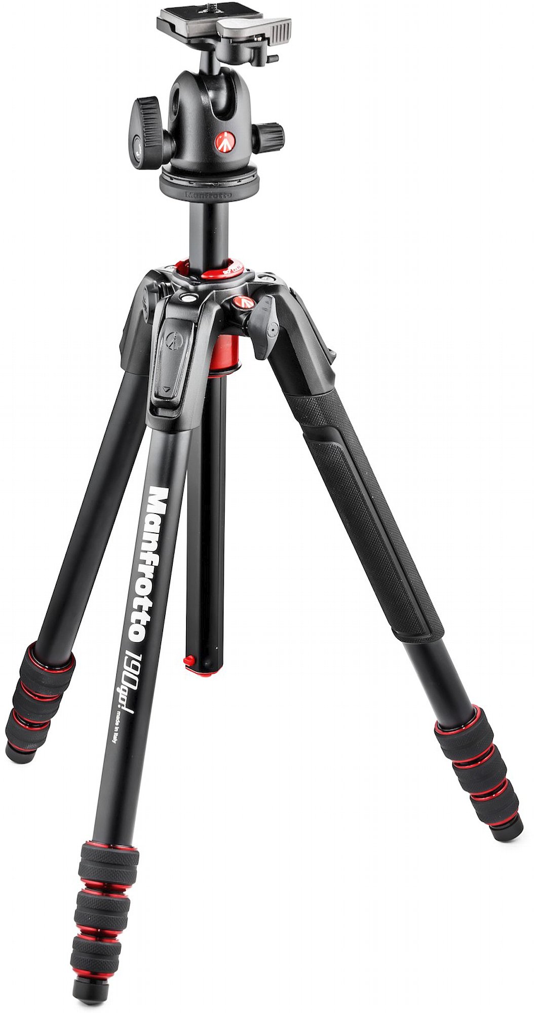 Das in Italien gefertigte 190Go! Ist in schwarz und Grau sowie als Carbonausführung erhältlich. Die Carbonausführung des Stativ ist nur in der Farbe Carbon erhältlich. Das 190Go! besitzt in vier Stufen anwinkelbaren Aluminiumbeine. Die vier Beinsegmente ermöglichen eine sehr geringe Transportgröße von nur 45 cm, bei 146 cm maximaler Arbeitshöhe. Durch die Kombination aus Beinwinkeländerungen und verschwenkbarer Mittesäule erlaubt das Stativ eine minimalste Arbeitshöhe. Als Beinfixierung dienen schnelle und einfach zu handhabende Drehverschlüsse. Zudem ist die Mittelsäule um 90° verschwenkbar, was es erlaubt die montierte Kamera schnell aus dem Stativmittelpunkt zu schwenken. Darüber hinaus bieten alle Stative der Manfrotto 190Go!-Serie einen Easy-Link-Anschluss, der es erlaubt schnell und einfach Zubehör am Stativ zu befestigen.