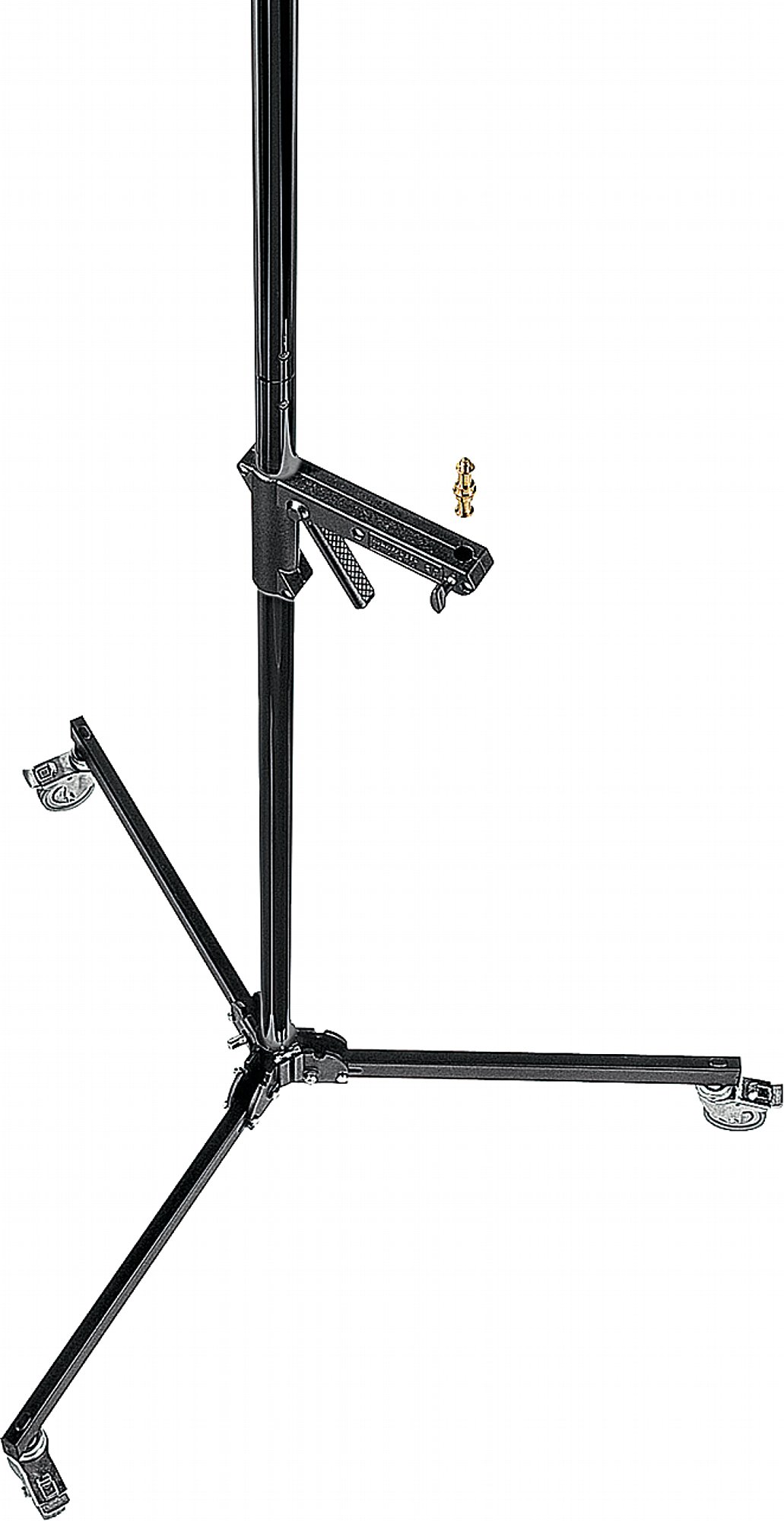 Leuchtenstativ mit Haltearm (185 mm), Material Aluminium, Farbe schwarz – Rohrdurchmesser 35 mm – 5/8" Hülse – Max. Höhe 250 cm – Min. Höhe 35 cm – Stellfläche Durchmesser 100 cm – Max. gleichmäßg verteilte Last 8 kg – Max. Last bei 5° Neigung und max. Auszug 2 kg – Gewicht 6,4 kg