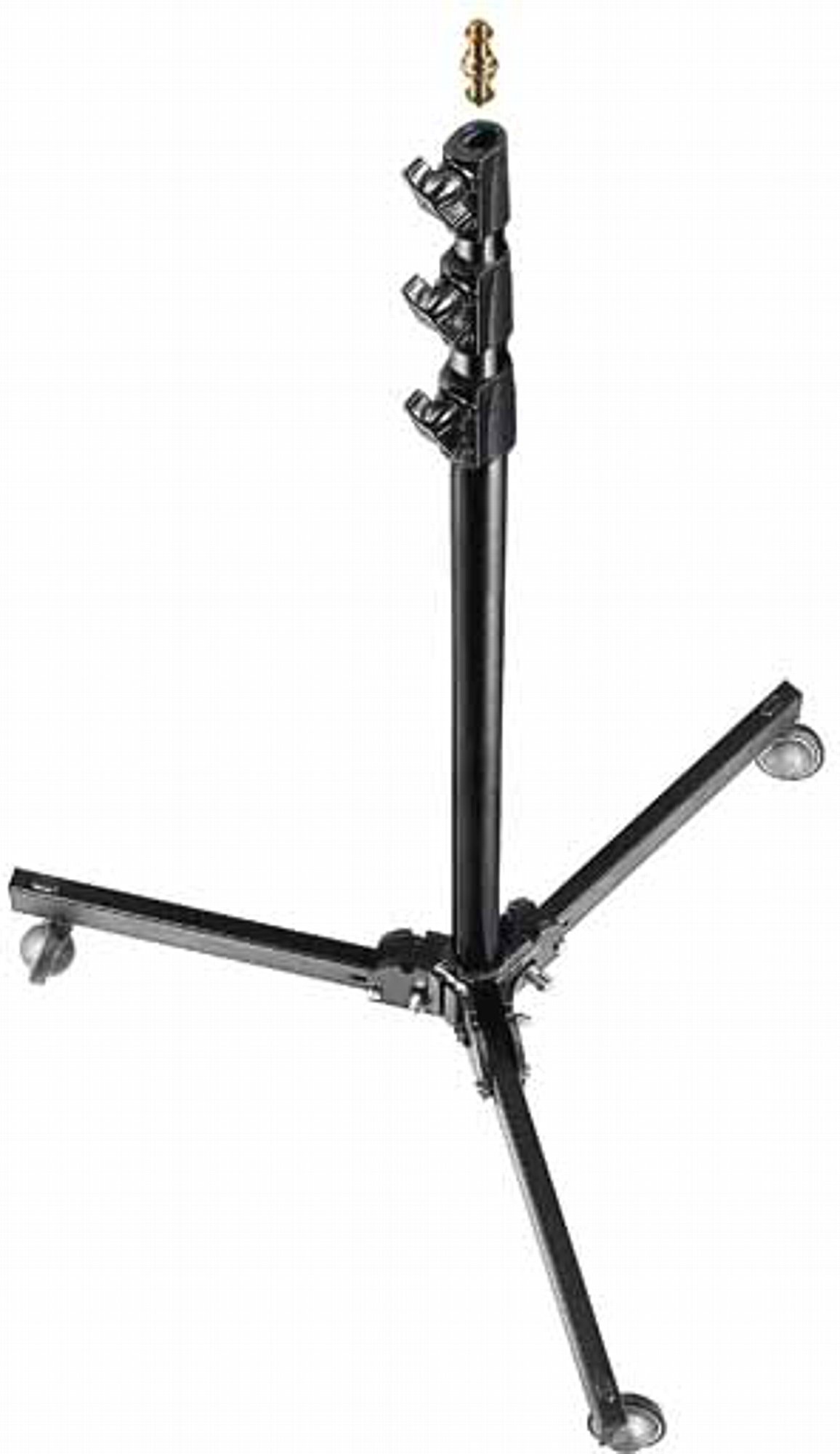 kompaktes Leuchtenstativ mit Rollen und einer maximalen Arbeitshöhe von 272 cm. Dabei bleibt das Stativ bis 12 Kilogramm belastbar und hat ein Eigengewicht von 4,8 Kilogramm.