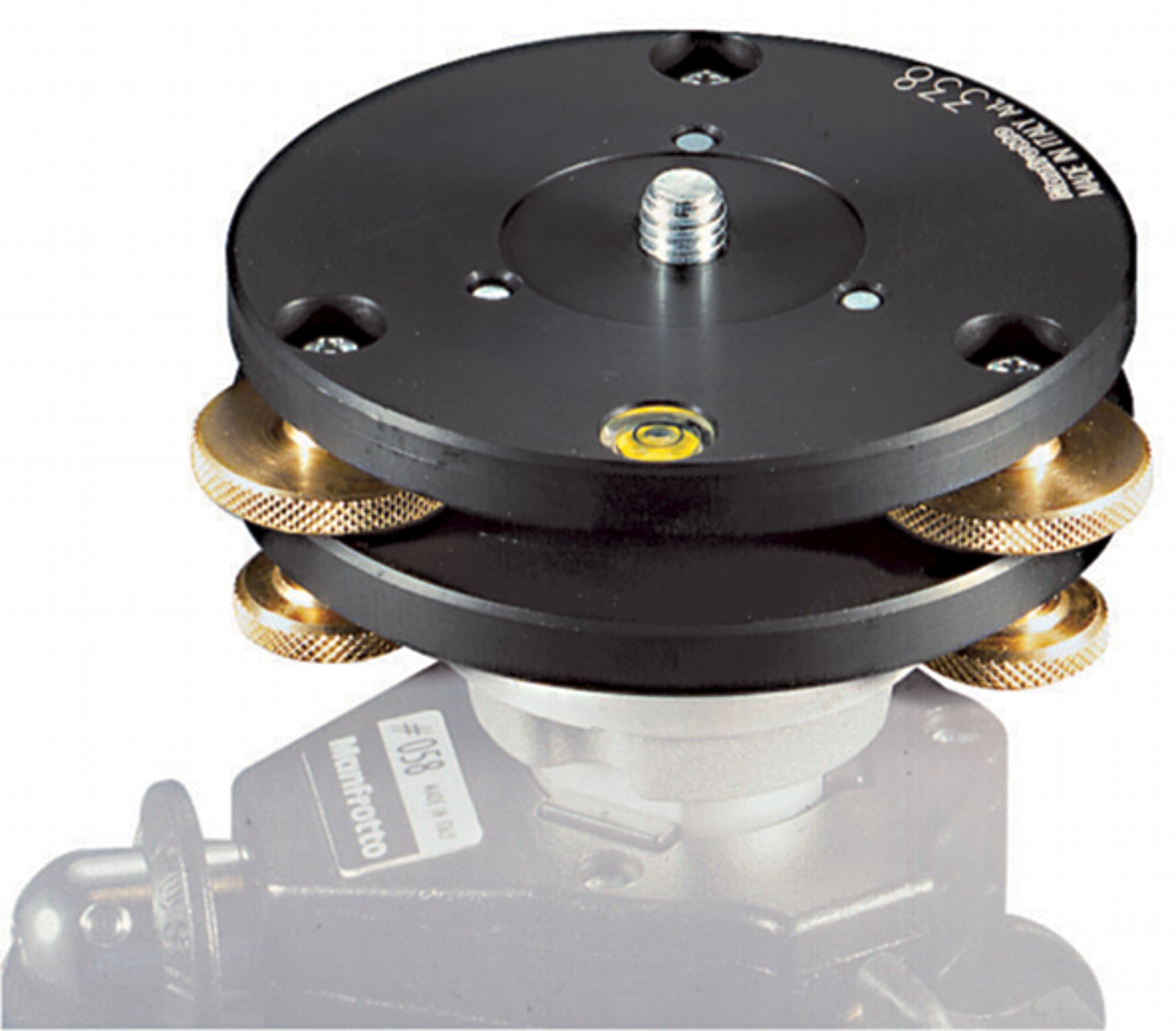 Der Nivelliersockel MA 338 wird zwischen Kopf und Stativ eingefügt und ist für jene Stative bestimmt, die über keine eingebaute Nivelliervorrichtung verfügen. Drei Justierschrauben gestatten die blitzschnelle Feineinstellung auf +/- 5°. Die Einstellung kann mittels individueller Klemmringe fixiert werden. Eine Nivellierlibelle ist eingebaut. Eine Stativbuchse 3/8" wird durch eine 3/8"-Kopfschraube ergänzt.