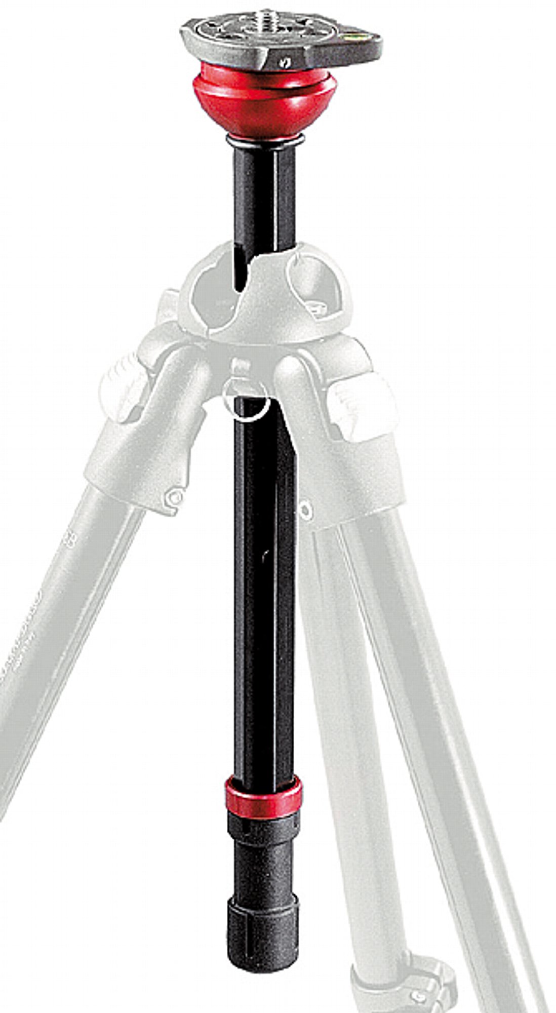 Mittelsäule mit Nivelliervorrichtung für Stative der Serie MA 190. Mit dieser Innovation können Sie Ihre Foto- oder Videokameras bequem und schnell nivellieren, ohne die Position und Auszugslänge der Beine verändern zu müssen. Damit ist eines der häufigsten Probleme bei Videoaufnahmen von Manfrotto elegant gelöst worden. Dank der Verwendung einer Nivellierhalbkugel von 50 mm Durchmesser, welche am oberen Ende der Mittelsäule fixiert ist, kann der Winkel der Neigekopfauflage individuell ausgerichtet werden. Die Halbkugel wird mit einem Drehgriff arretiert und gelöst, welcher sich am Ende der Mittelsäule befindet. Dieser Griff wird beim Einsetzen der Mittelsäule einfach abgeschraubt. Die Halbkugel verfügt über eine eingebaute Nivellier-Libelle sowie eine 3/8“ Kameraschraube (m), welche zur Befestigung eines Foto- oder Videoneigers dient.