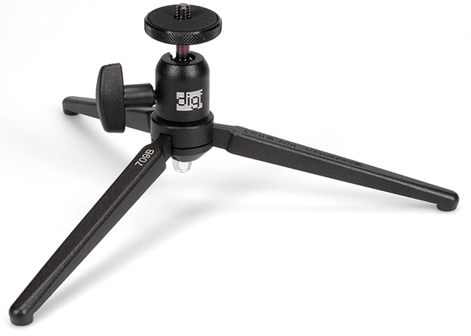 Ganz in Schwarz-Metallic präsentiert sich das Digi 709 Tischstativ, die preisgünstigste Variante der Manfrotto Tischstative. Es besitzt aber die gleiche gute Standfestigkeit aller drei Varianten (geeignet für Kameras bis 2 kg), da die Mechanik des Unterteils identisch ist. Die drei sehr stabilen ausklappbaren Beine bilden eine große Standfläche. Die Füße haben Kork-Auflageflächen und lassen dadurch empfindliche Oberflächen heil. Das Manfrotto Digi 709 besitzt einen kompakten, fest angebauten Kugelkopf und hat dadurch das kleinste Packmaß unter den Tischstativen vom Manfrotto.