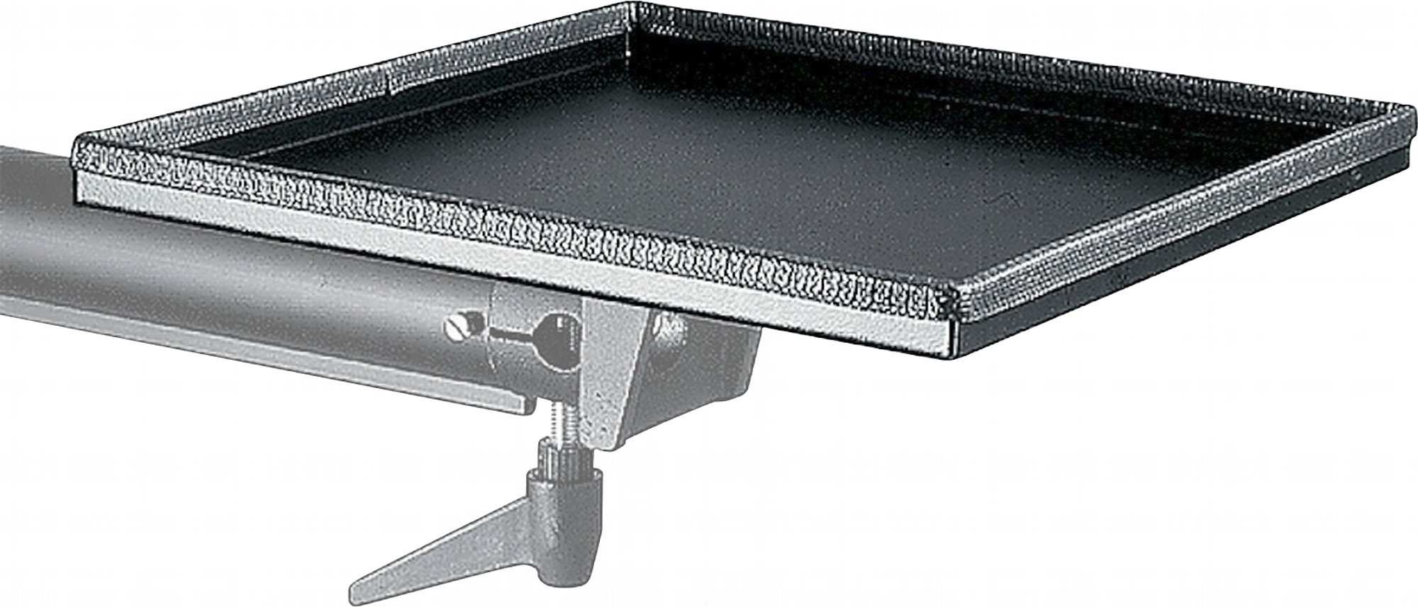 Die optionale Ablageschale 844 wird per Knebelschraube an den Querarm eines kompatiblen Säulenstativs befestigt. Die Ablageschalle misst 29 x 29 cm und wiegt 2200 Gramm.