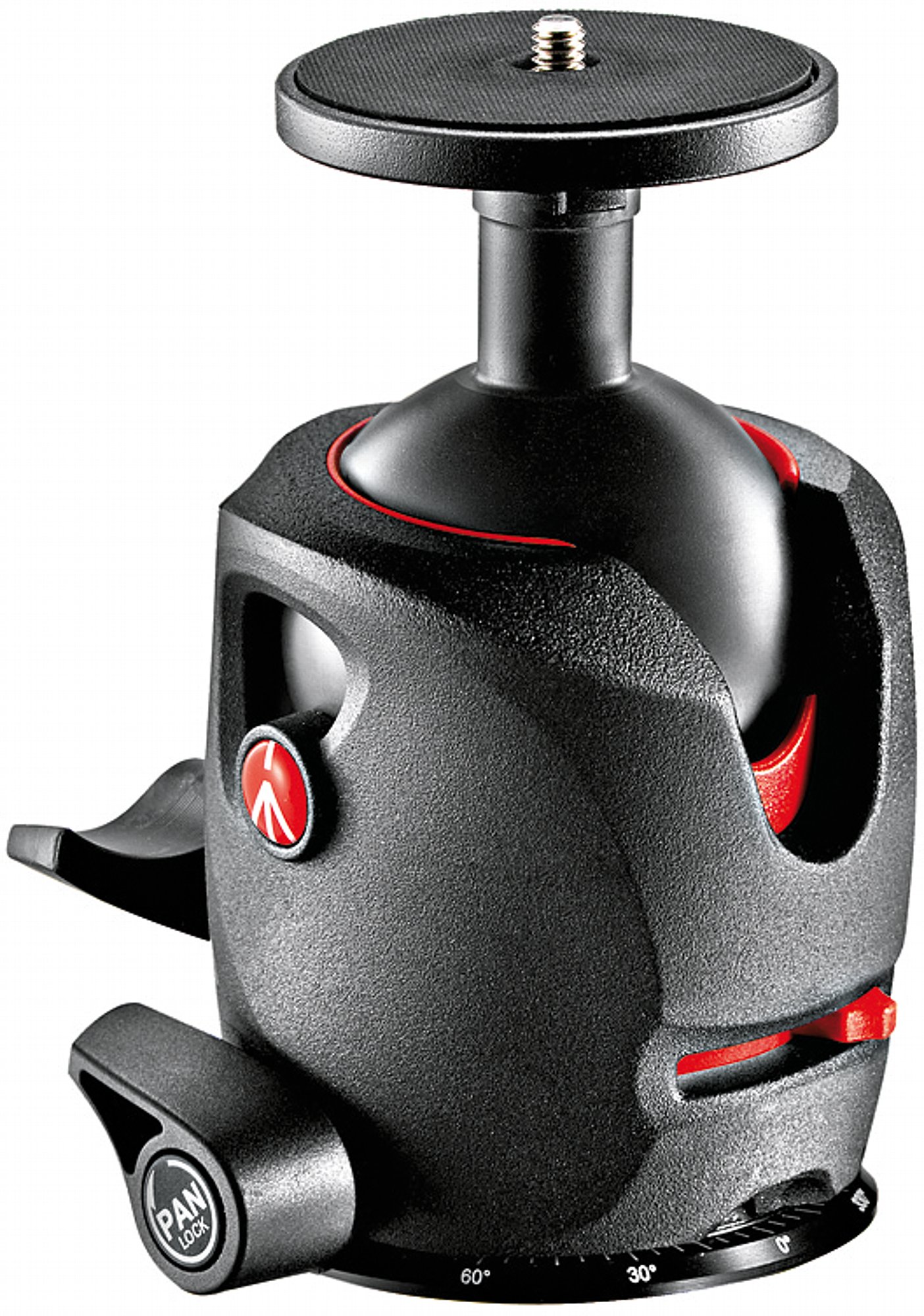 Robuster Präzisionskugelkopf aus Magnesium, zwei Libellen zur exakten Positionierung, separate Kugel- und Panoramablockierung, Gradskala, Friktionseinstellung zur Anpassung des Kameragewichtes, Montage auf allen Manfrotto-Stativen (3/8"), Schnellwechseleinrichtung mit Sicherungshebel, 1/4" und 3/8" Kameraschraube, Farbe Schwarz – Rotation 360° – Neigung +103° bis -40° – Höhe 137 cm – Gewicht 1,185 kg – maximale Belastbarkeit 15 kg