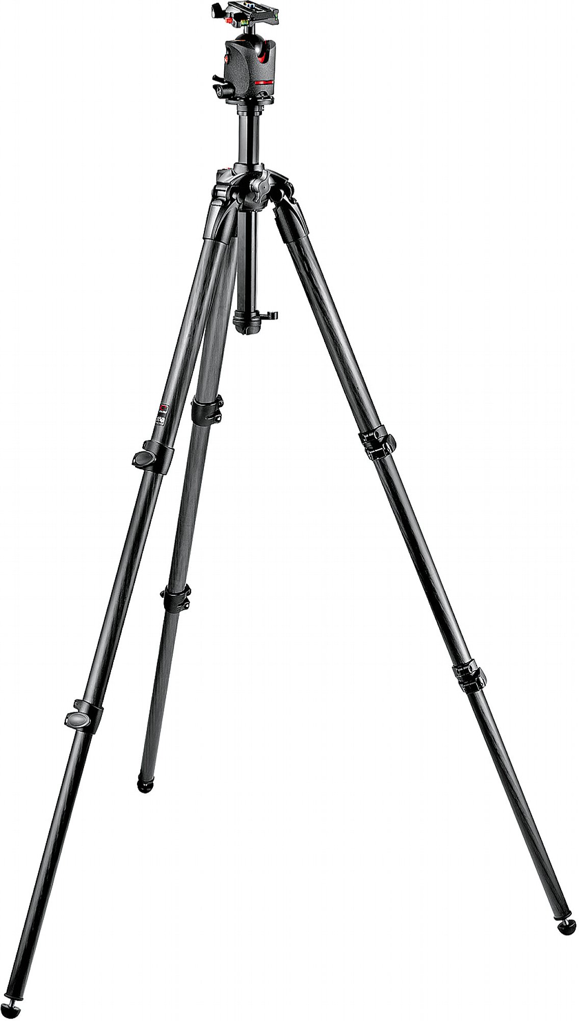 Videostativset, bestehend aus: MMH057M0-Q5 Robuster Präzisionskugelkopf aus Magnesium, drei Libellen zur exakten Positionierung, separate Kugel- und Panoramablockierung, Gradskala, Friktionseinstellung zur Anpassung des Kameragewichtes, Montage auf allen Manfrotto-Stativen (3/8"), Schnellwechseleinrichtung mit Sicherungshebel, Schnellwechselplatte 501PL, 1/4" und 3/8" Kameraschraube, Farbe Schwarz – Rotation 360° – Neigung +103° bis -40° – Höhe 14,6 cm – Gewicht 1,31 kg – maximale Belastbarkeit 15 kg MT057C3 Großes, belastbares Kamerastativ mit Schiebemittelsäule und Stativbeinen aus Carbon mit 3 Sektionen, Montageplatte aus Magenesium-Legierung (3/8" und Sicherungsschrauben) für Manfrotto Neigeköpfe, Nivellier-Libelle, drei Beinanstellwinkel (23, 50 und 75 Grad) einstellbar, Gummifüße mit herausdrehbaren Spikes, Tragegurt; Farbe Schwarz – Länge geschlossen, zusammengeschoben 62 cm – minimale Arbeitshöhe 22 cm – max. Arbeitshöhe (eingefahrene Mittelsäule) 132 cm – max. Arbeitshöhe (ausgefahrene Mittelsäule) 157 cm – Gewicht 3,0 kg – maximale Belastbarkeit 18 kg