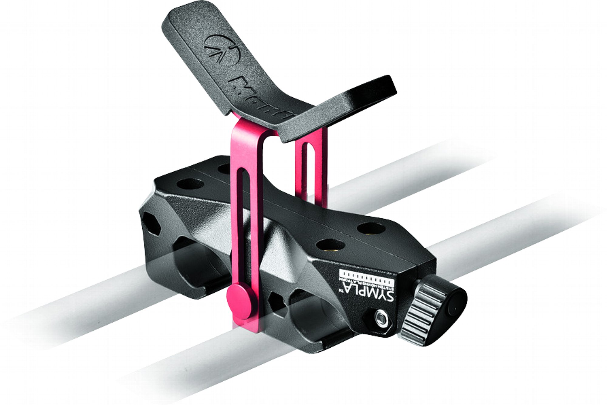 Die Sympla Objektivstütze hat eine gebogene, gummierte Auflagefläche, die so weit nach oben gesetzt werden kann, bis sie fest am Objektiv anliegt. Dadurch werden bei der Verwendung der Objektivschelle als Verbindung der Kamera mit Sympla Vibrationen vermieden. Die jeweilige Höheneinstellung wird mit einem verstellbaren Verriegelungshebel festgesetzt.