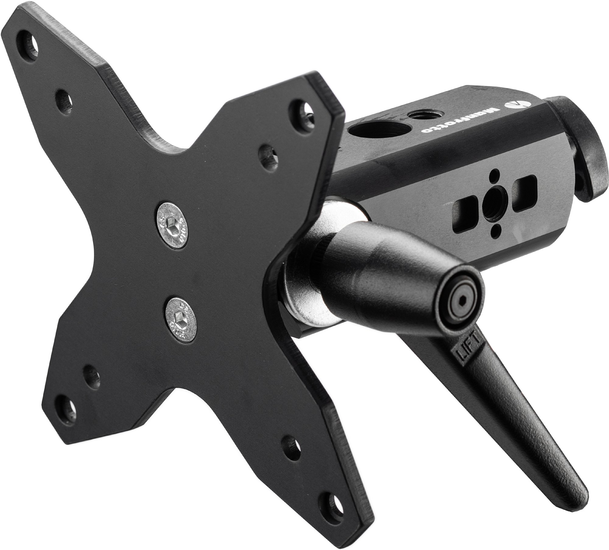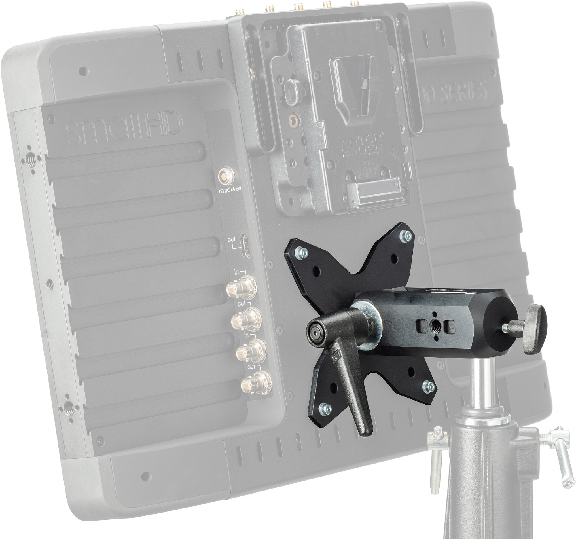Die VESA-Halterung verfügt über mehrere integrierte Befestigungspunkte für Zubehör, wie z.B. eine 3/8'''-Gewindebohrung mit Verdrehsicherung im Stil von Manfrotto und ARRI, eine zweite 3/8''-Gewindebohrung für weiteres Zubehör und eine zusätzliche 16 mm (5/8''')-Buchse, die die Verwendung von wichtigem Zubehör wie z.B. Friktionsarmen und kleinem Beleuchtungszubehör für die Montage von drahtlosen Empfängern, Blitz- oder LED-Beleuchtung, Audiogeräten oder kompakten Kameraaufbauten ermöglicht.